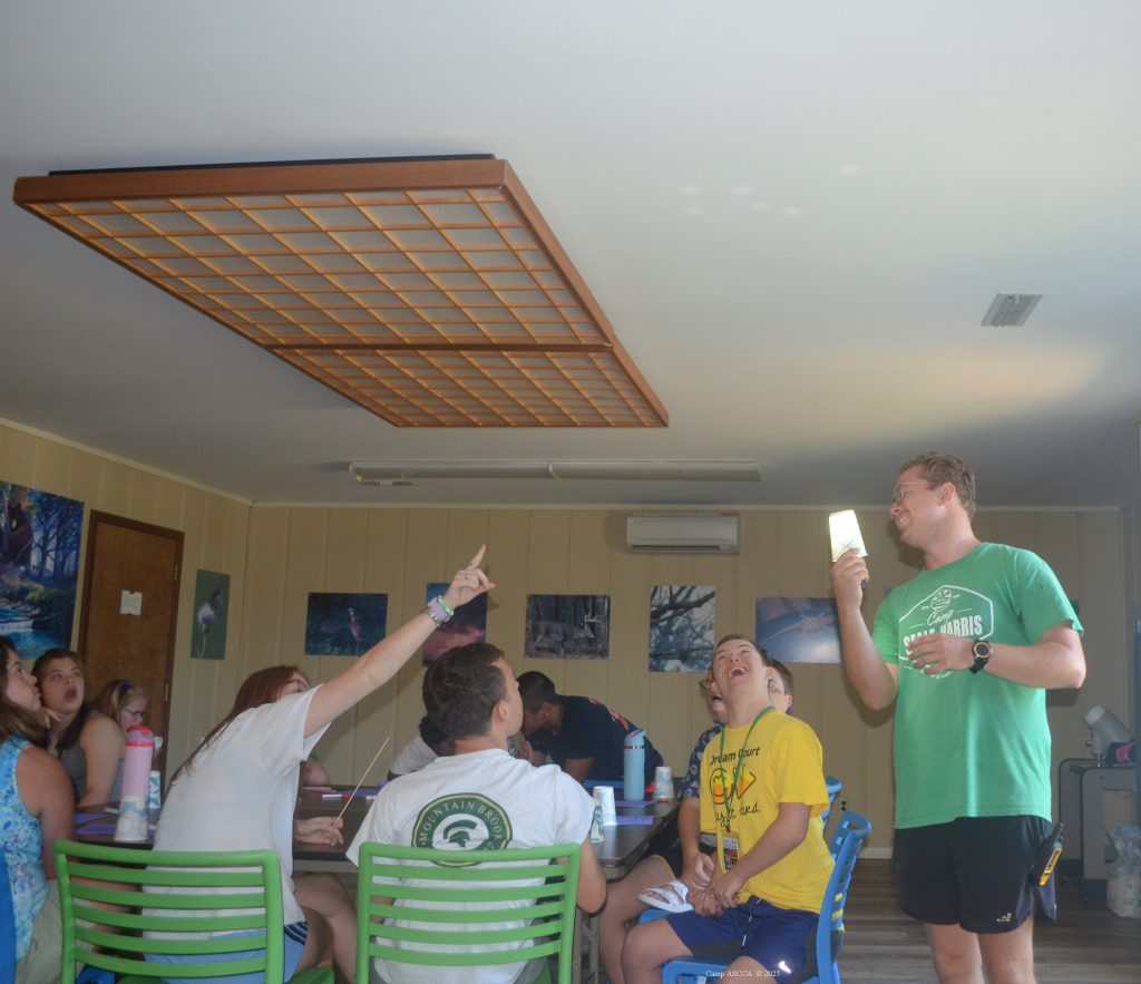After their lesson on constellations, the campers had the chance to create their own! They drew designs of what they wanted their constellations to look like, and with the counselors’ help, they poked holes in the bottom of cups to replicate their drawings. Once they finished, we turned off the lights and shined a flashlight through the cups, making their “stars” appear on the ceiling!